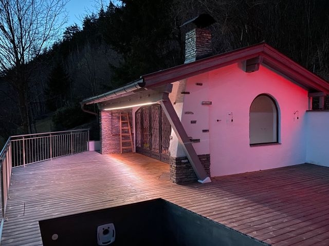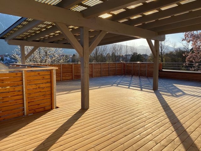 Die fast 100m2 grosse Terrasse lädt zu geselligen Grillabenden ein. Als Kontrapunkt findet sich bergseitig eine Loggia, ein grosszuegiges Poolhaus mit offener Feuerstelle und ein fantastisches Swimming Pool mit Blick über Spittal.