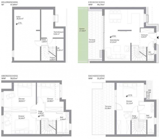 Weiter gehört ein Stellplatz mit 12,5 m² zum Reihenhaus.