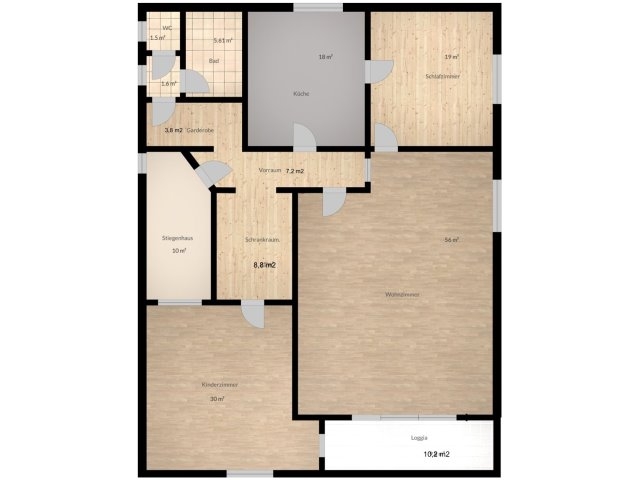 Wohnzimmer Kinderzimmer (teilbar), Schlafzimmer, Küche, Bad, WC, Schrankraum, Loggia