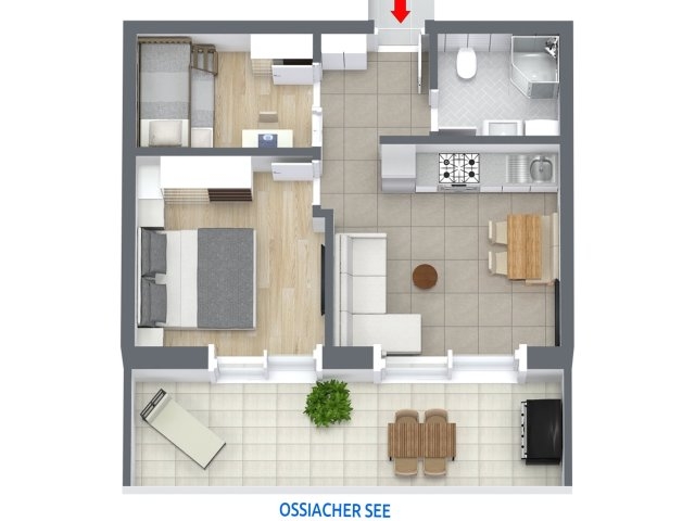 Wohn-Ess-Kochbereich, 2 Schlafzimmer, 1 Bäder, 1 WC, Vorraum, Terrasse