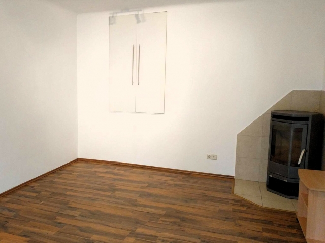 Wohn-/Esszimmer mit Ausgang auf den Balkon, Holzofen